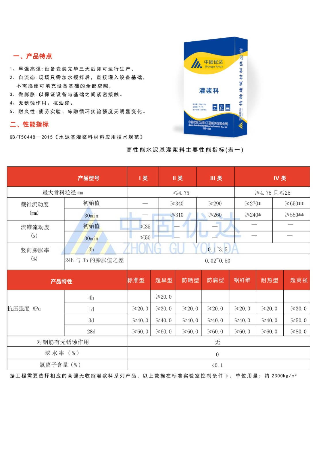 早強、高強、抗離析、綠色環(huán)保、微膨脹性、自流性好、粘結度高、耐久性強、抗開裂等