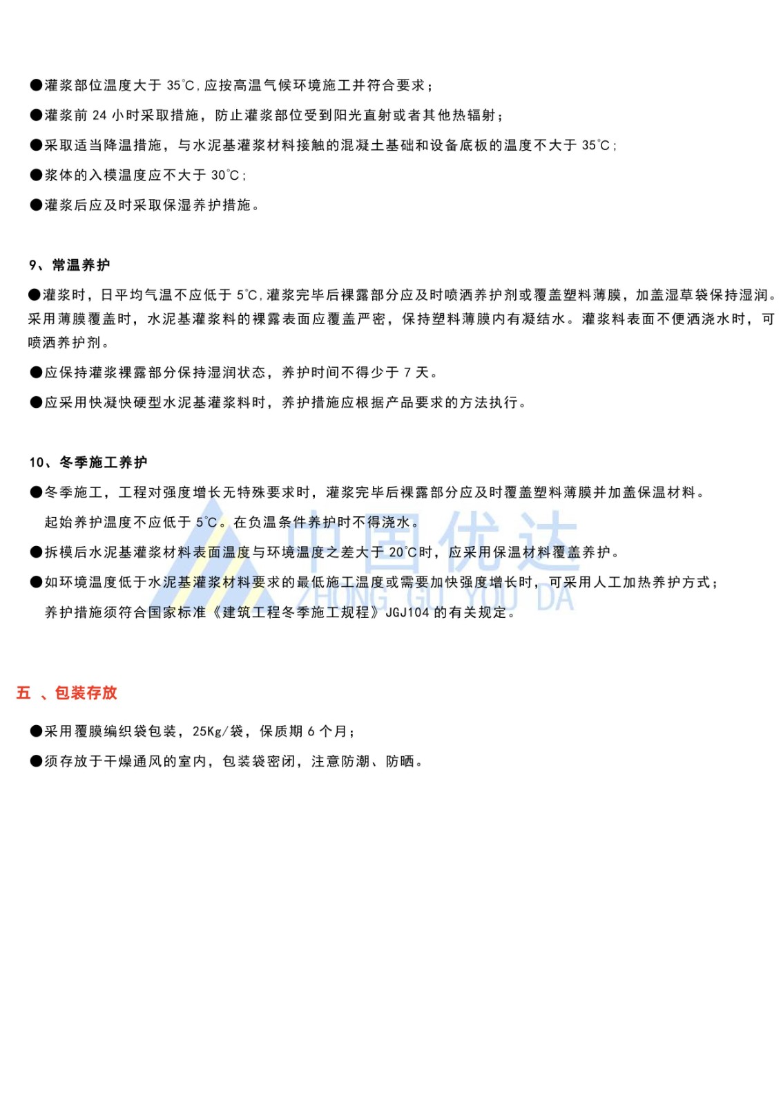 7、高強無收縮灌漿料不能與普通水泥混用,不能摻入外加劑。